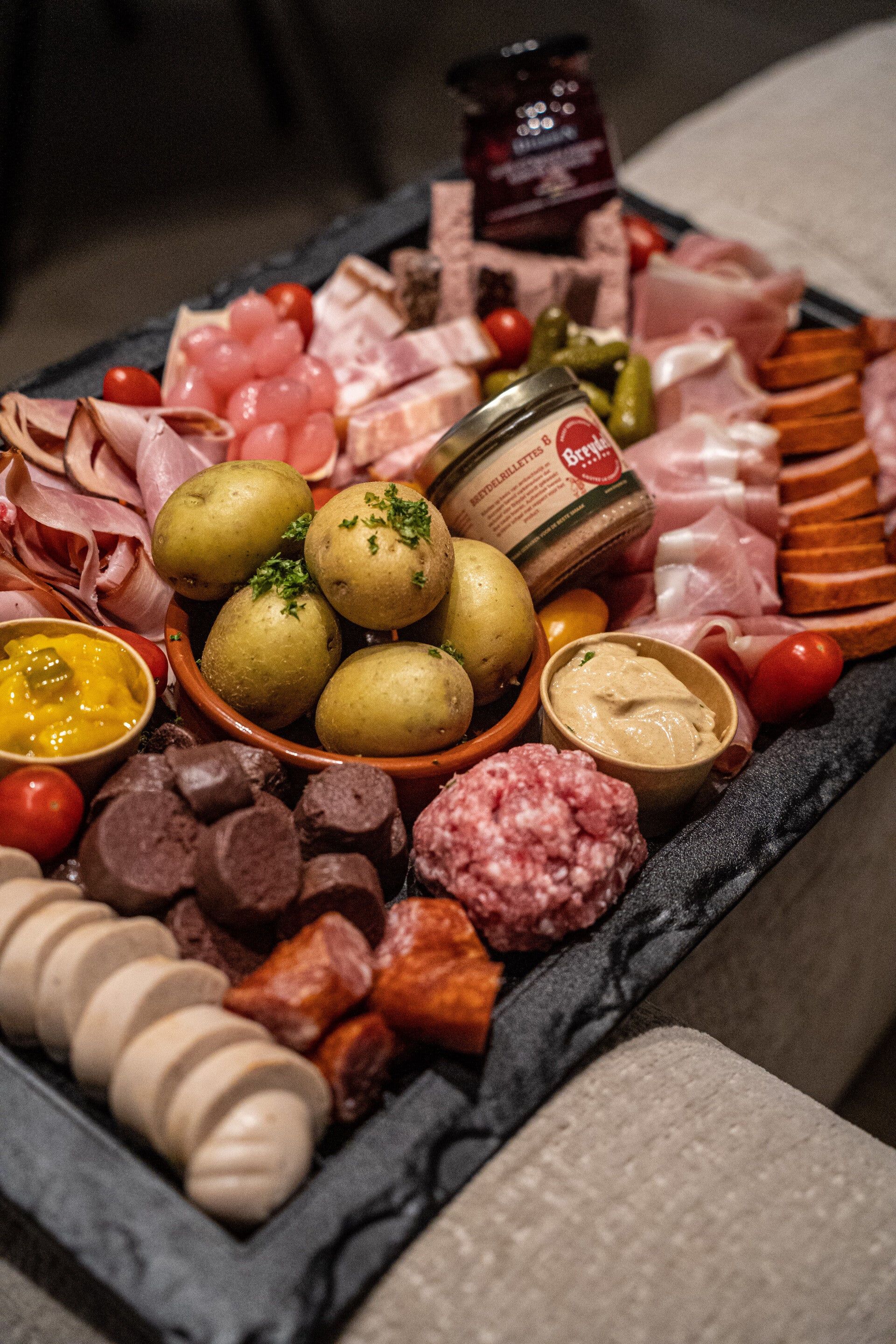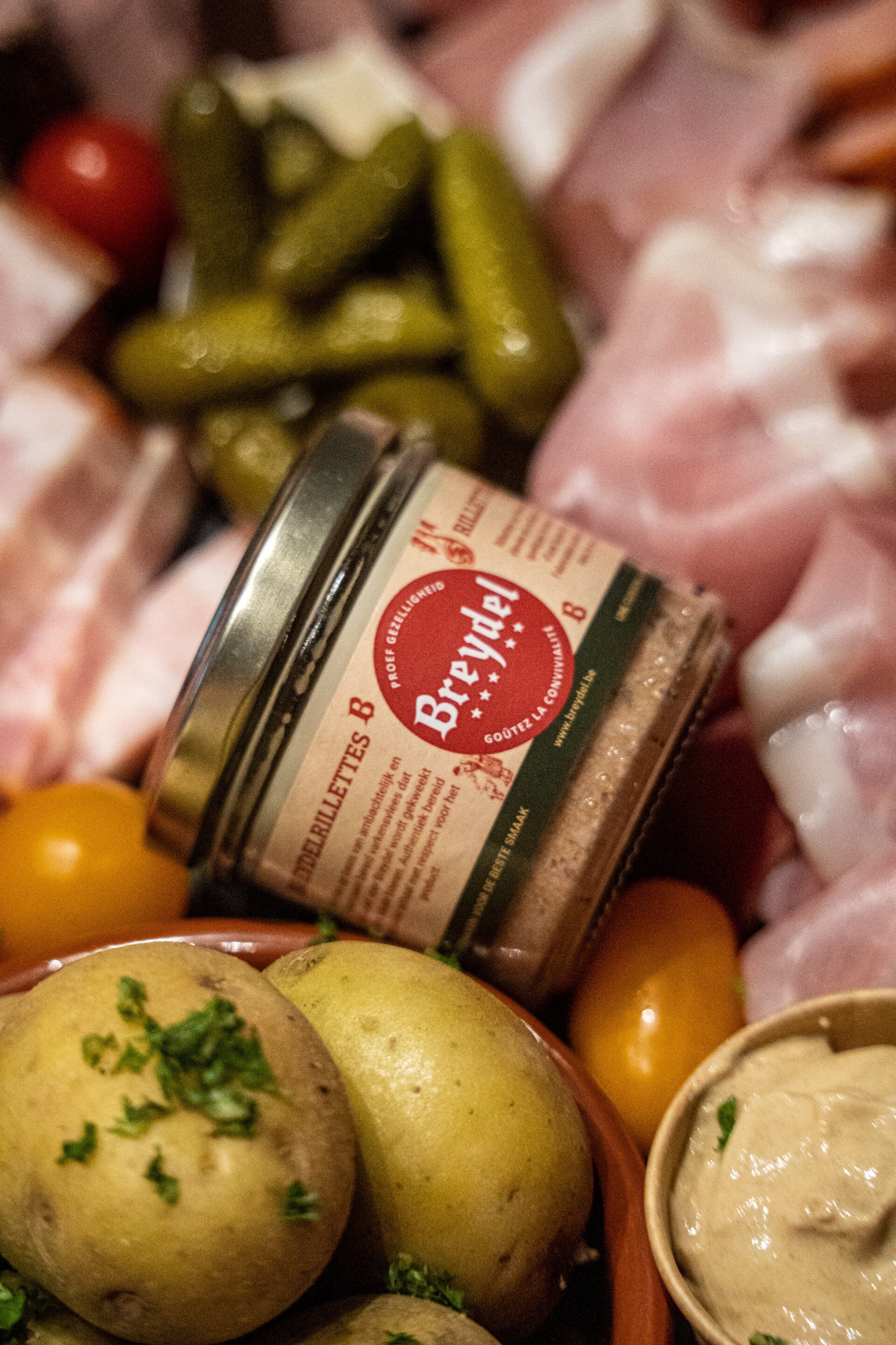 Rijkelijk gevulde breugheltafel, ambachtelijke lokale charcuterie, vergezeld van zilveruitjes, augurkjes, mosterd en koude krielpatatjes.